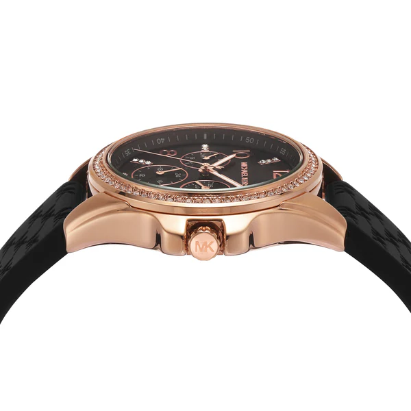 Štýlové dámske hodinky Michael Kors MK7373 si zamilujú všetky dámy, ktoré vyhľadávajú kvalitne spracované doplnky. Vo vnútri odolného, 10 mm vysokého púzdra, ktoré tvorí kvalitná oceľ nájdete spoľahlivý batériový (quartz) strojček poháňajúci v priemere 36 mm široký ciferník. Ten spoľahlivo chráni odolné minerálne sklíčko. Ako sami vidíte, púzdro zahalila ružovozlatá, ciferník čierna a remienok čierna farba. Z hľadiska materiálu vedie silikón a jeho dĺžku, v tomto prípade 200 mm si môžete ľahko upraviť na obvod svojho zápästia. Ciferník je zasadený vo výraznom puzdre, ktoré je lemované jemnými krištálikmi. Tieto hodinky disponujú stupňom vodotesnosti 5 ATM.