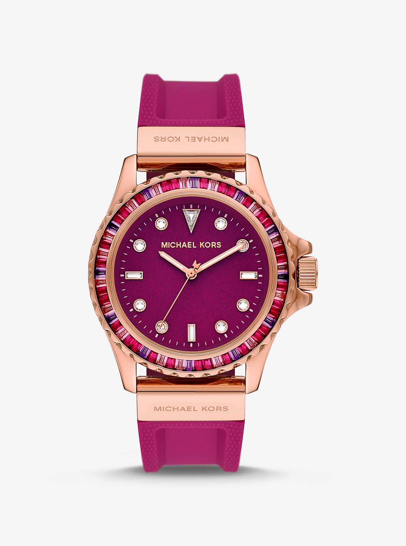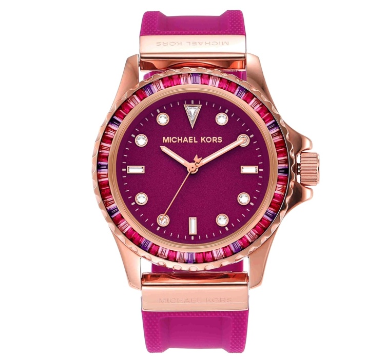 Štýlové dámske hodinky Michael Kors MK7441 si zamilujú všetky dámy, ktoré vyhľadávajú kvalitne spracované doplnky. Vo vnútri odolného, 12,5 mm vysokého púzdra, ktoré tvorí kvalitná oceľ nájdete spoľahlivý batériový (quartz) strojček poháňajúci v priemere 41 mm široký ciferník. Ten spoľahlivo chráni odolné minerálne sklíčko. Ako sami vidíte, púzdro zahalila ružovozlatá, ciferník a remienok bordová farba. Ciferník je zasadený vo výraznom puzdre, ktoré je lemované krištálikmi. Z hľadiska materiálu vedie silikón a jeho dĺžku, v tomto prípade 200 mm si môžete ľahko upraviť na obvod svojho zápästia. Tieto hodinky disponujú stupňom vodotesnosti 5 ATM.